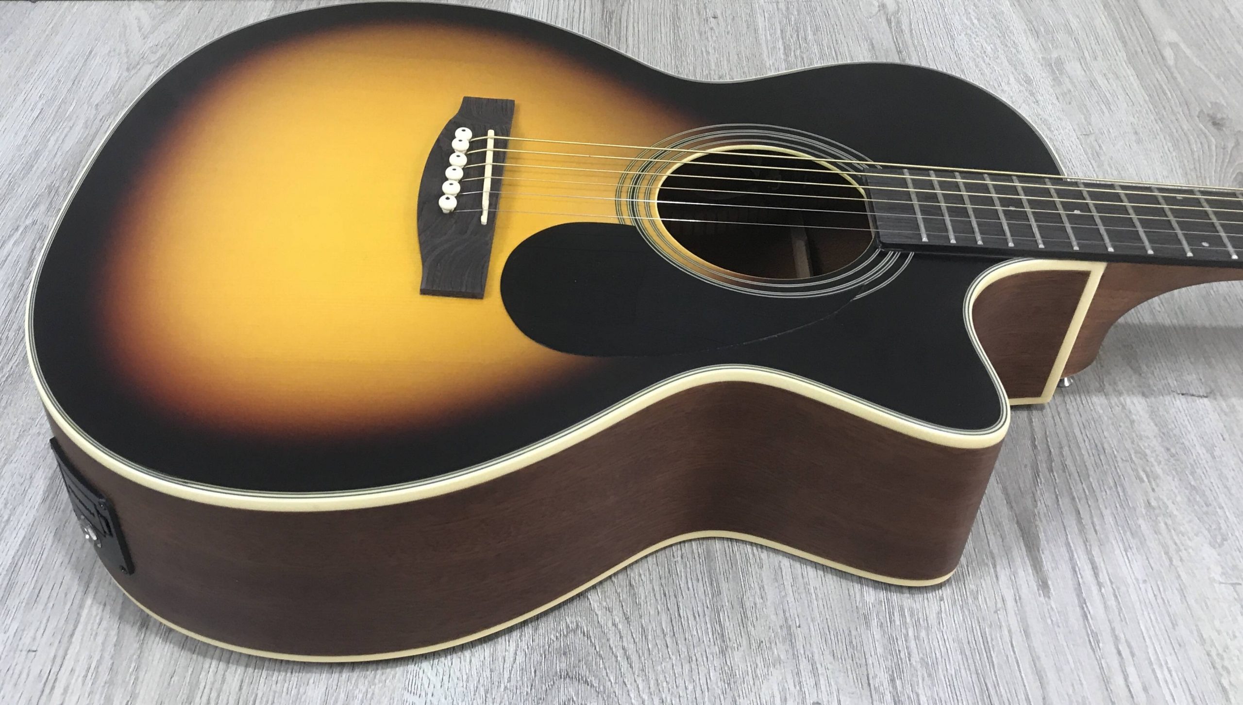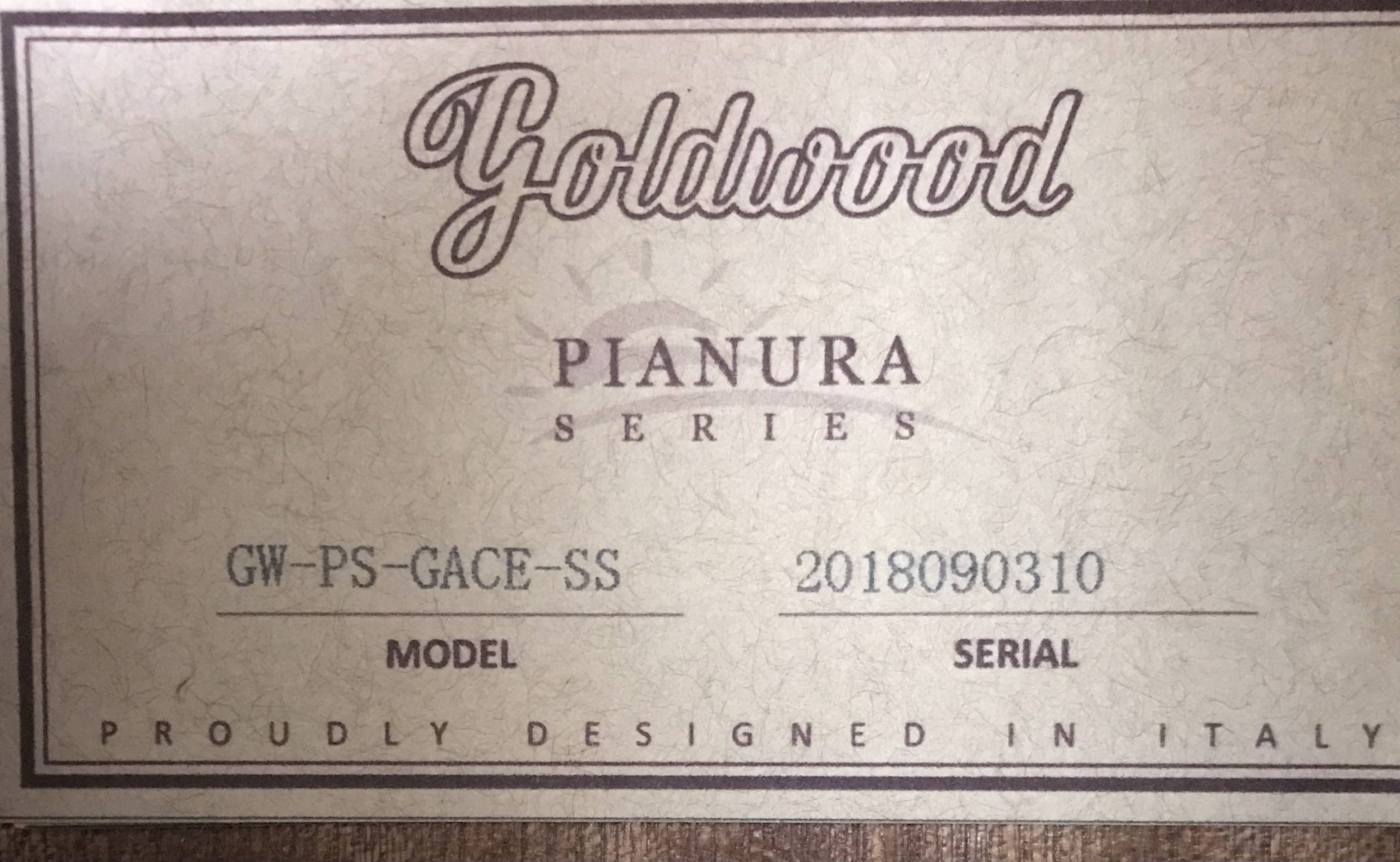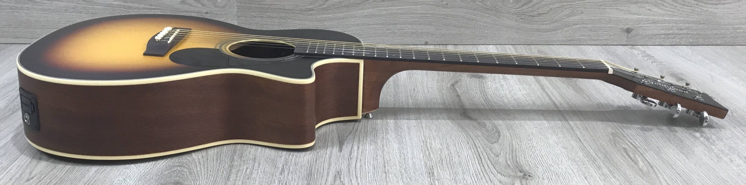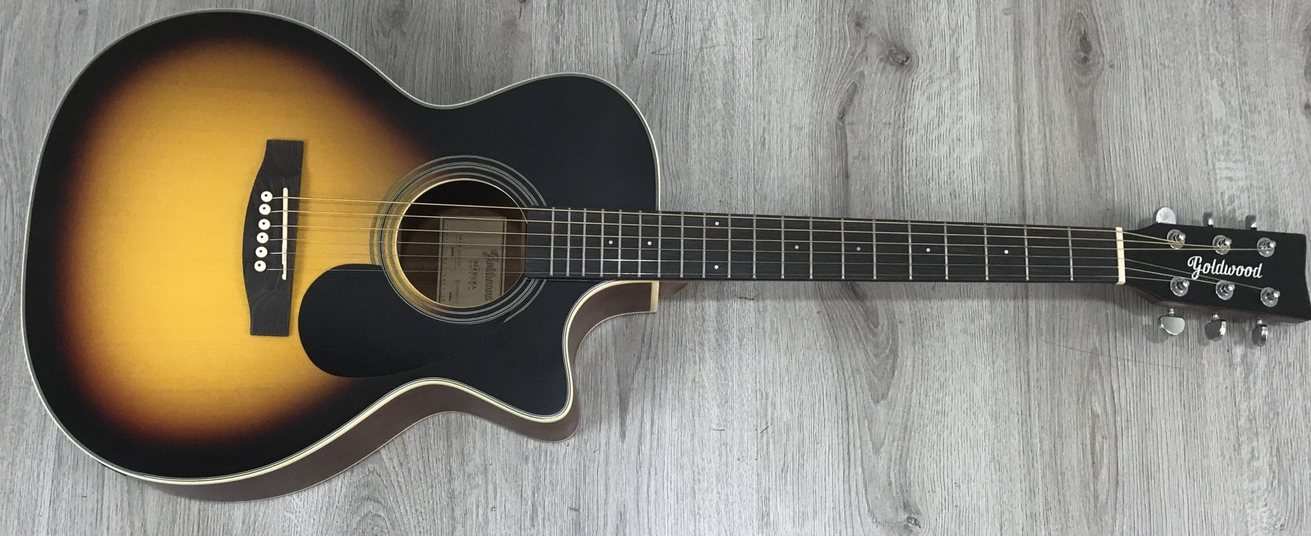 La Goldwood GW-PS-GACE-SS è una chitarra acustica amplfiicata con corpo grand auditorium, fondo e fasce in mogano, manico in mogano, tastiera riverstita in ebano, potente ebano, capotasto 43mm, e sistema di amplificazione fishman presys II
